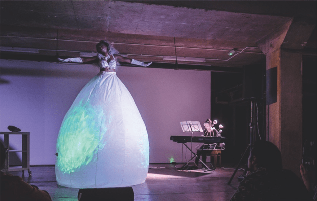 Spear’s pessimistic view of late capitalism and its alien voyeurs is contrasted by Lady Vendredi’s utopian afrofuturist piece Neon Dream. Mixing aspects of Haitian Vodou and contemporary composition Lady Vendredi aka Nwando Ebizie presents the audience with a parallel dimension attained through sacrificial offerings (prosecco, crisps) and the transformative power of the four elements (psychedelic fires, sea of balloons, a giant egg, inflatable clothes). Collaborating with pianist Yung Yee Chen and director Jonathan Grieve, Ebizie combines colourful postmodern pop with theatrics rooted in the shamanic rites of Guillermo Gómez-Peña and the Loa spirit world.