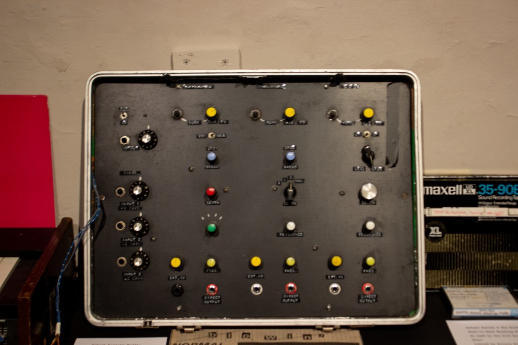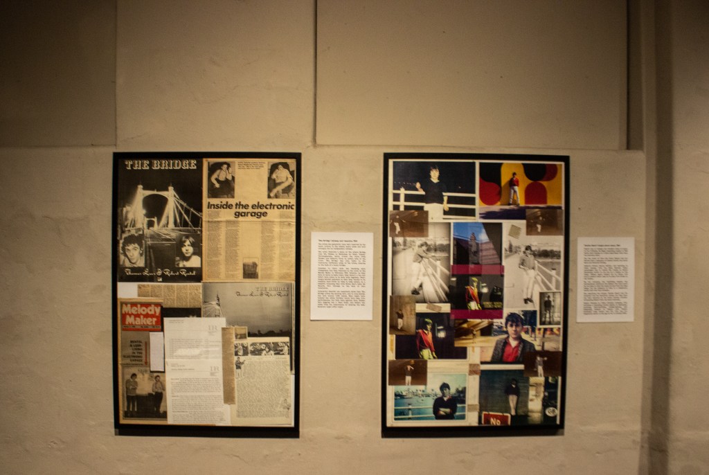 The show is curated chronologically with the narrative following a clockwise direction around the venue’s basement. The story is told primarily through large frames holding collages of press clippings and photographs. Generously detailed explanatory notes are mounted on the walls, but a zine, authored by curator Simon Dell and published by Encyclopaedia Electronica, is available to purchase for anyone who wants to dive deeper. There are cassette demos, backing tapes and original vinyl pressings displayed in the glass cabinets, but the biggest draw for many will be the instruments. For example, Daniel Miller of Mute Records loaned his noticeably weathered (but still functional) Korg 700S synthesizer, on which he wrote ‘Warm Leatherette’ and ‘T.V.O.D’. Many of the items, however, come courtesy of Thomas Leer himself or Hilary Farrow, Robert Rental’s widow. Also on display is the acid-coloured EDP Wasp, a synth which tended to spontaneously play itself when the temperature in a club rose too high, but one that also gave The Bridge its signature sound.
