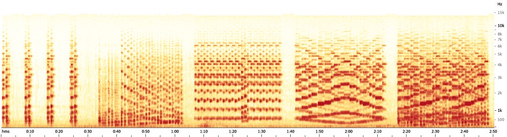 ‘Bruitistisk koncert nr. 1’ (Bruitist Concert No. 1) by Bamse Kragh-Jacobsen employed the sound of a studio test-plate which, when played back, would emit sine tones of descending frequencies every fifteen seconds. An additional horn can be heard every ten seconds, after which Kragh-Jacobsen would begin a piano figure in a recurring A-B, A-BB, A-BBB, A-BBBB, A-BBBBB pattern. The figure starts over once the horn sounds again and so on until the end.