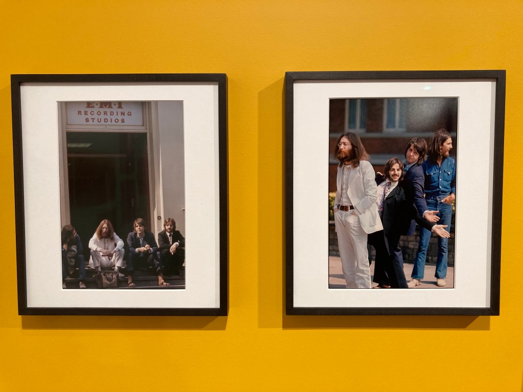 Thankfully, a series of prints by Linda McCartney allows the public to make a comparison between the moment as it was captured, and the final product. Iain Macmillan’s portrait of The Beatles for Abbey Road is woven into our cultural fabric to such a degree that copycat covers have become a cliché. This is best exemplified by the nearly naked Red Hot Chili Peppers crossing the same street with socks on their cocks (The Abbey Road E.P., 1988; not on display). McCartney’s behind the scenes shots, however, show The Beatles as human beings grown tired of their iconic status, but who are willing to play along one final time. A shot of a passer-by talking to Ringo Starr, while the rest of the band wait to cross, is touching.