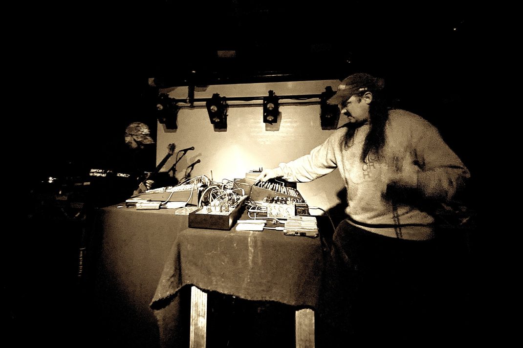 Each of the duo controls a minimal set-up consisting of cassette players, mixers and effects pedals. Swanson also has a small modular rig and reel-to-reel machine that provide accents of meat and grit respectively. “Peace Eternity” is built around three chords that loop, modulate and sway. The sequence evolves gradually, picking up dusty artefacts along the way as it fixes into a steady rhythm. Mindel’s body convulses as he punches notes into his guitar. This movement is echoed in the duo’s shaking of cabled joysticks that add to the wall of fuzz. And yet melody lurks in the mirth, suggesting the track is about survival rather than ruin. Swelling like an anxiety attack, it’s all over before you can catch your breath.