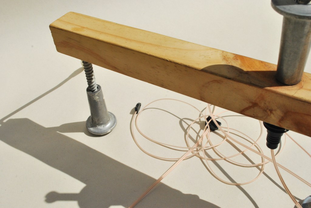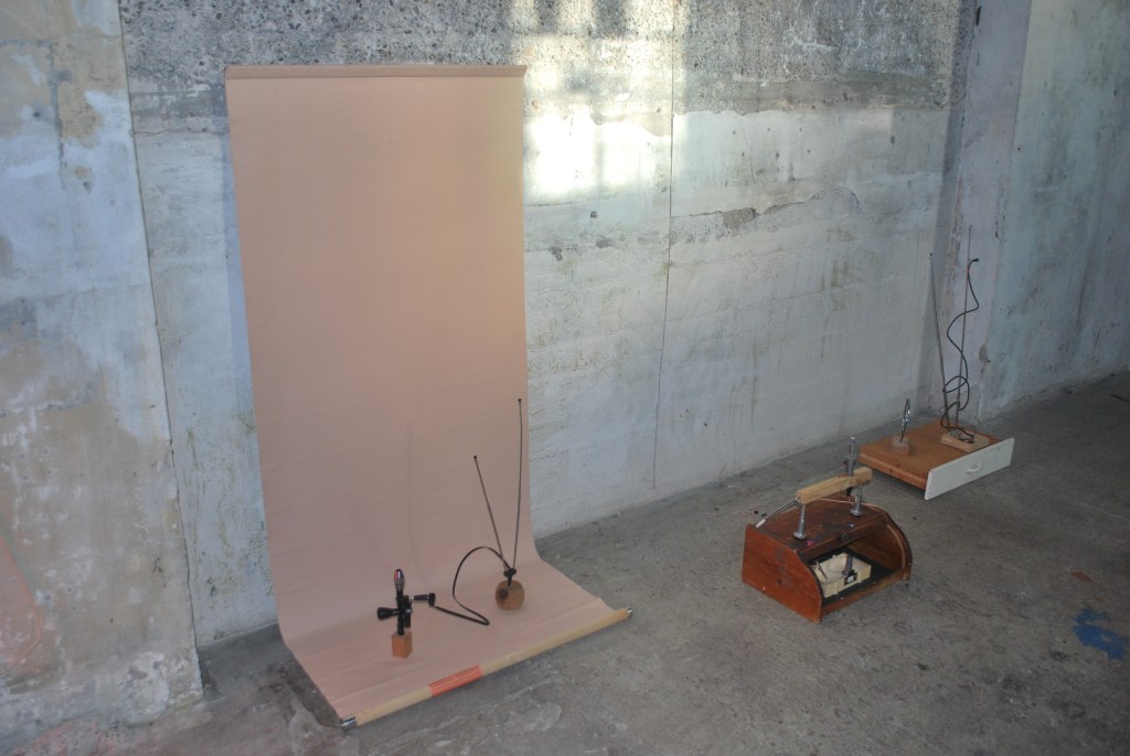 Building a VLF receiver is not very complicated and parts can be purchased online. However, my first two attempts (INSPIRE VLF-3 and Techlib’s Super-Tiny VLF receiver) ended in failure. Out of frustration, I began putting various discarded objects together and recording the sounds of their construction. Some of these objects – old antennae, copper wires et al – had obvious connotations with radio. Conversely, their wooden counterparts lacked a progressive technological conviction. This aesthetic shift ran parallel with the mute allure possessed by the concrete mirrors. I became increasingly more interested in recording interference from buried power lines and thinking about how the propagation of these radio waves contributes to our acoustic ecology.